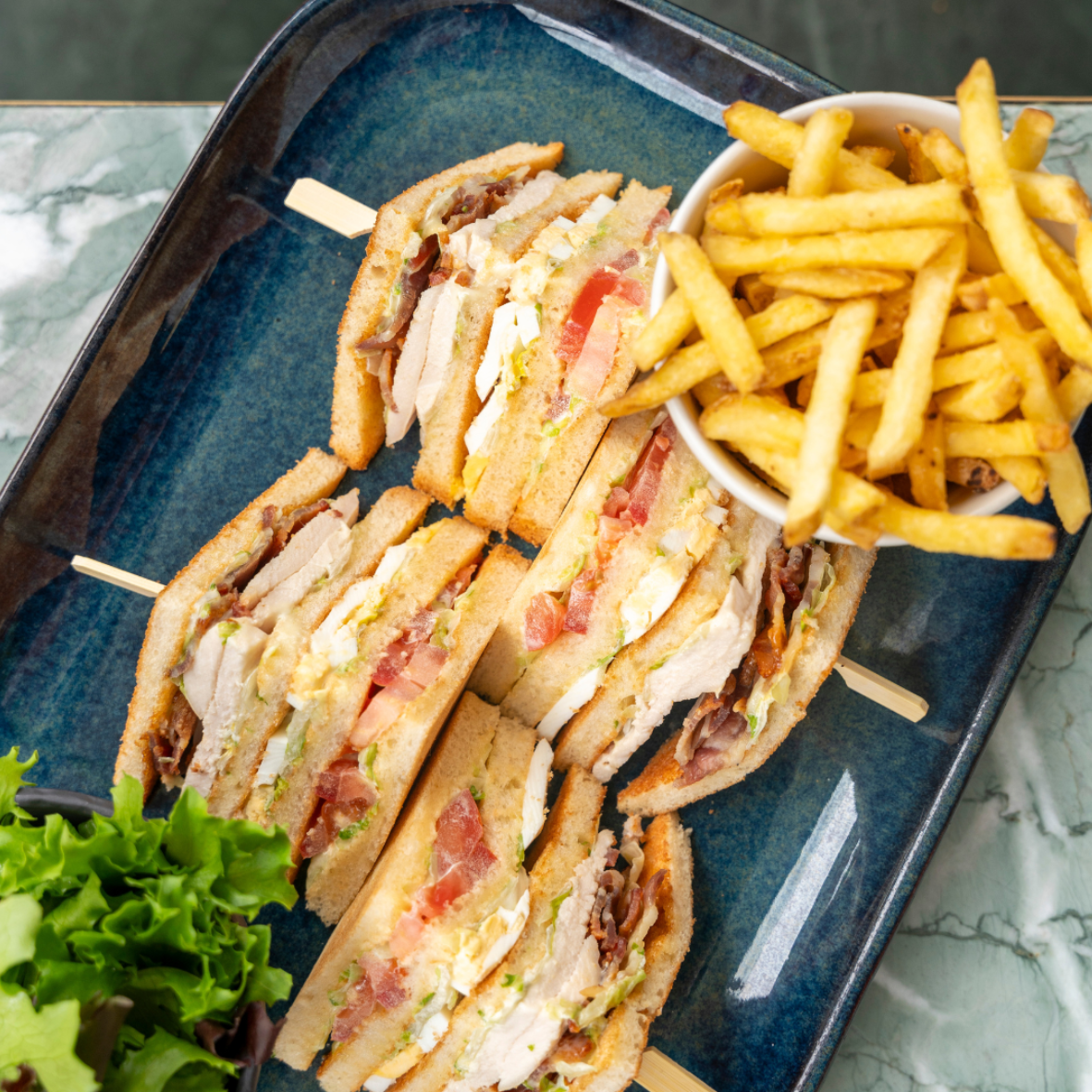 Club sandwich, French fries and mesclun salad, with or without bacon
