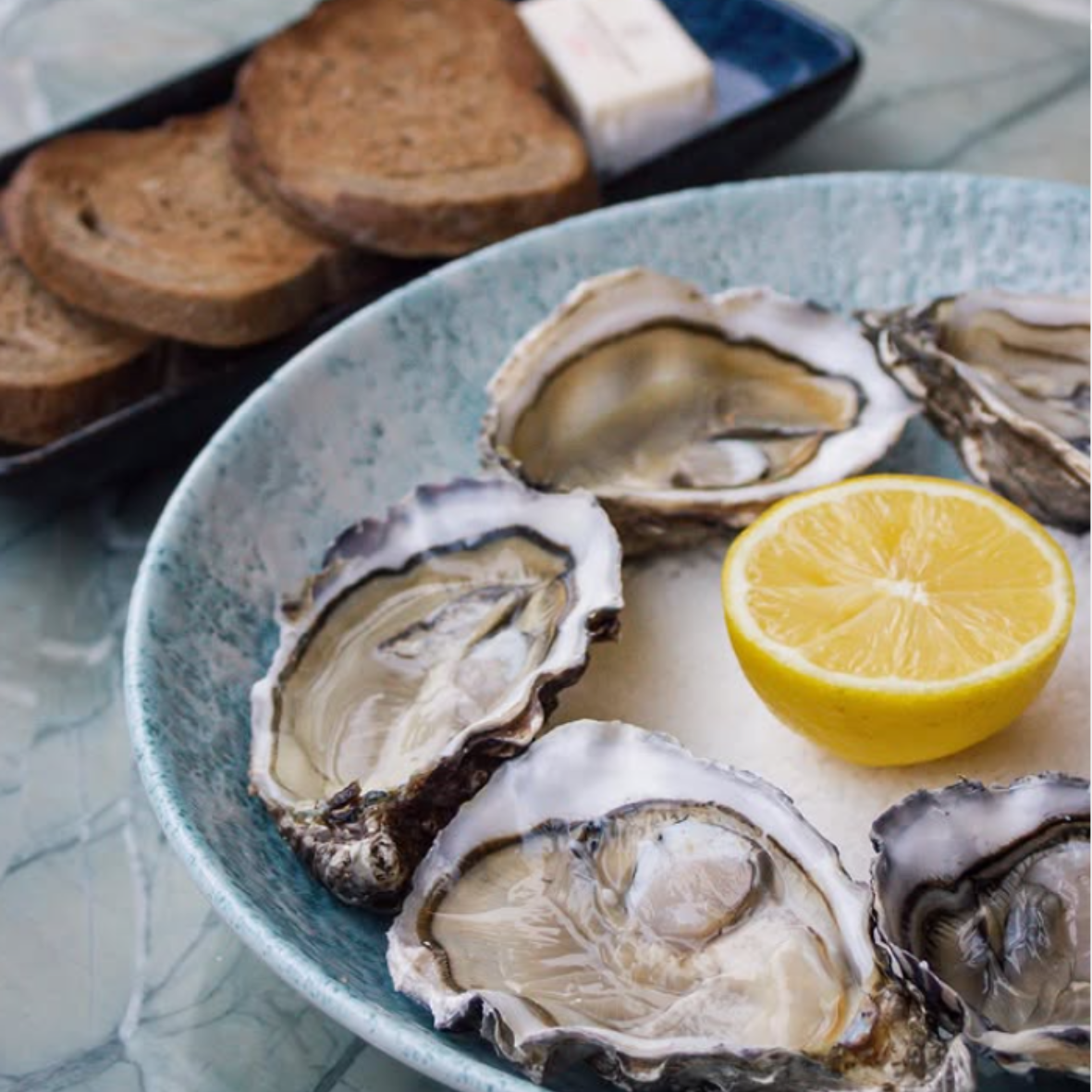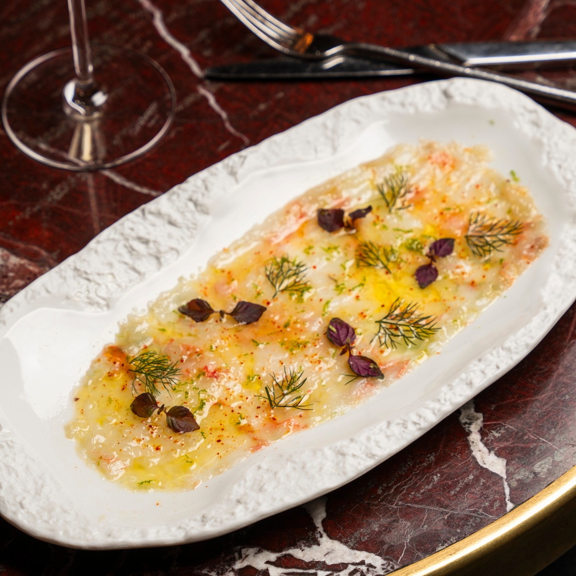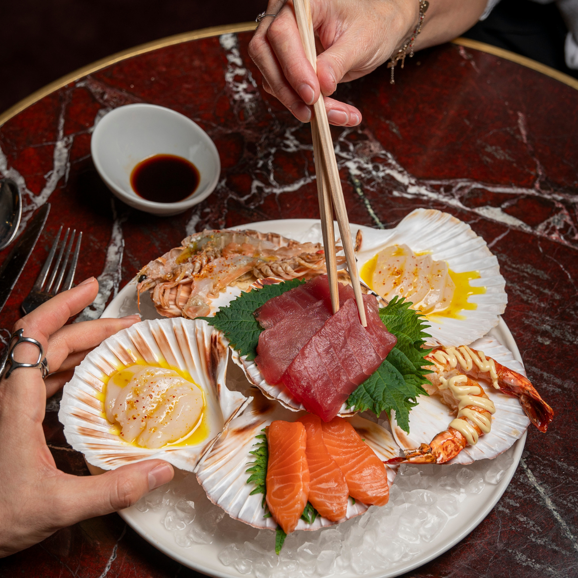 Kys Marine oysters, sakura; langoustine crudo with yuzu; tuna sashimi; Black Tiger shrimp and curry-spiced scallops