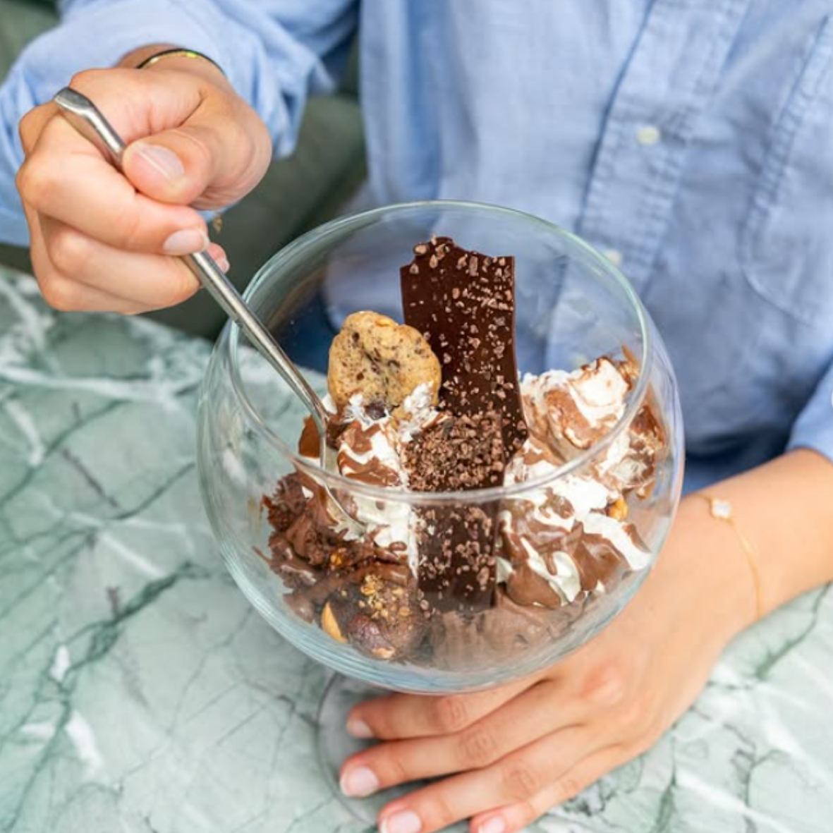 Glaces chocolat, brownie, cookie, noix de pécan caramélisées, copeaux de chocolat, chantilly, sauce chocolat-noisette / Chocolate ice creams, brownie, cookie, caramelized pecan nuts, chocolate chips, whipped cream, chocolate-hazelnut sauce