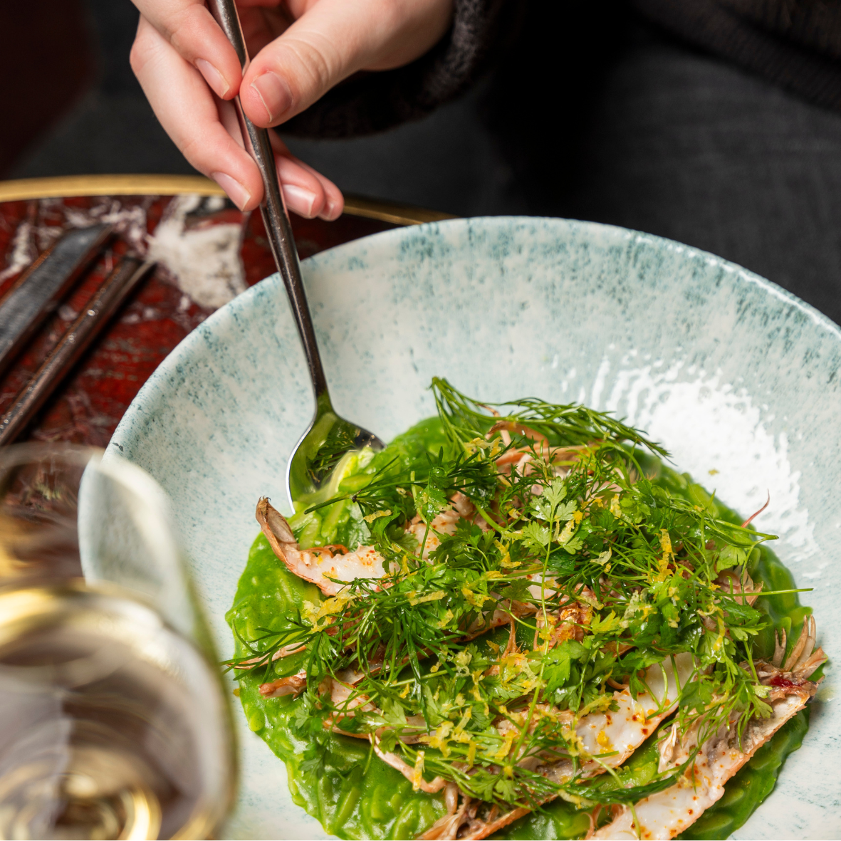 Orzo cooked in herb juice, lightly cooked langoustines