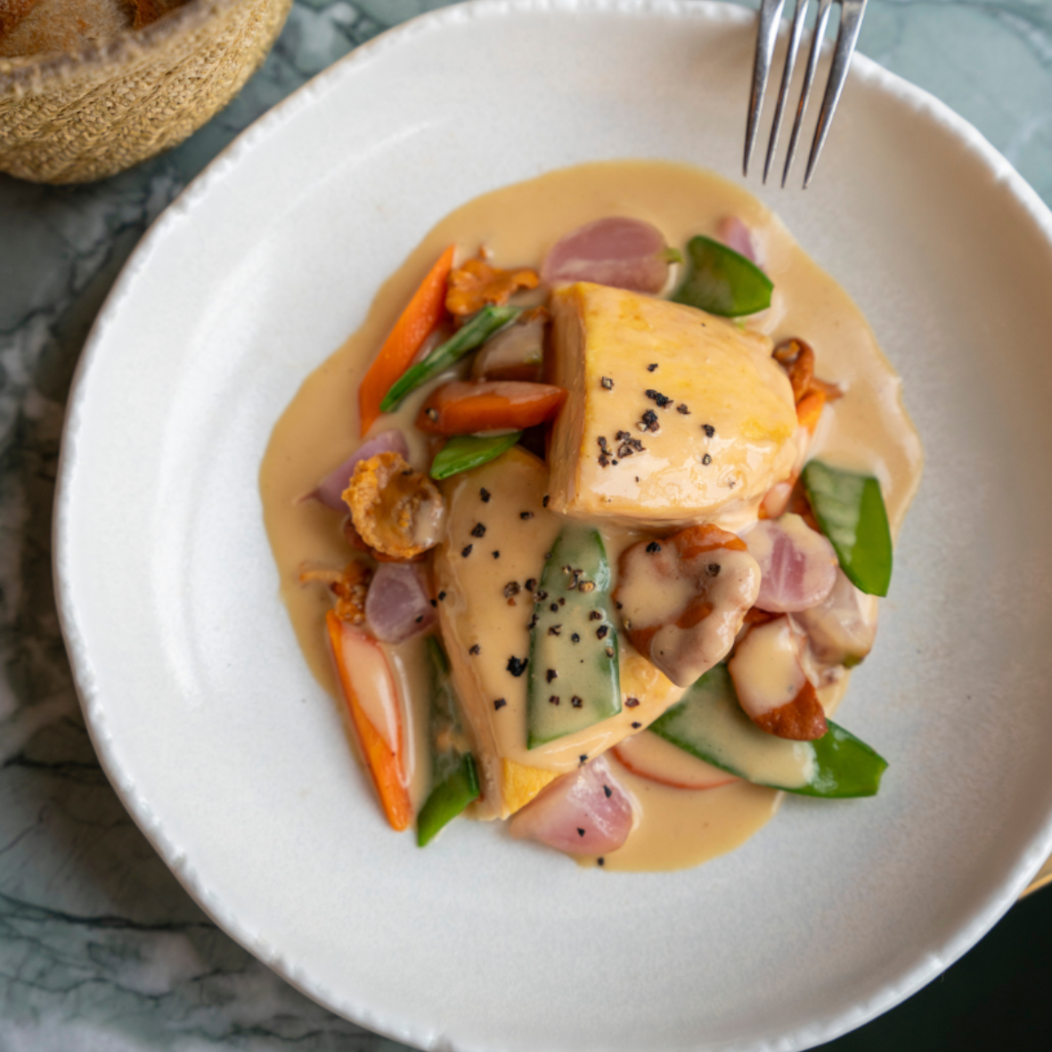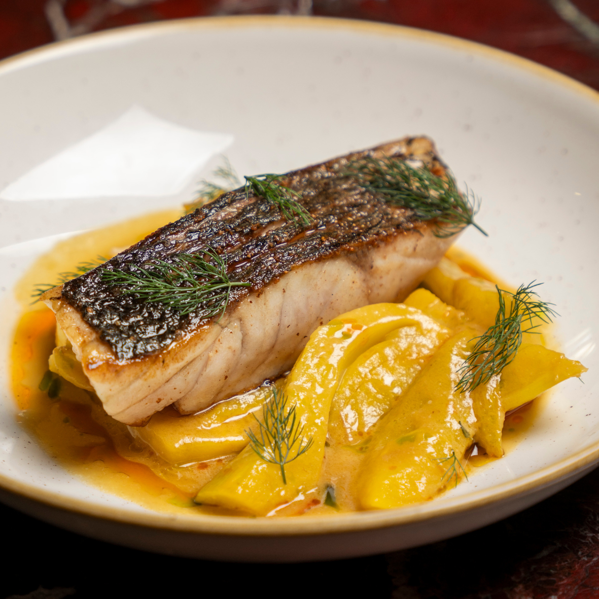 Roasted meagre with a saffron and fennel vegetable bouillabaisse