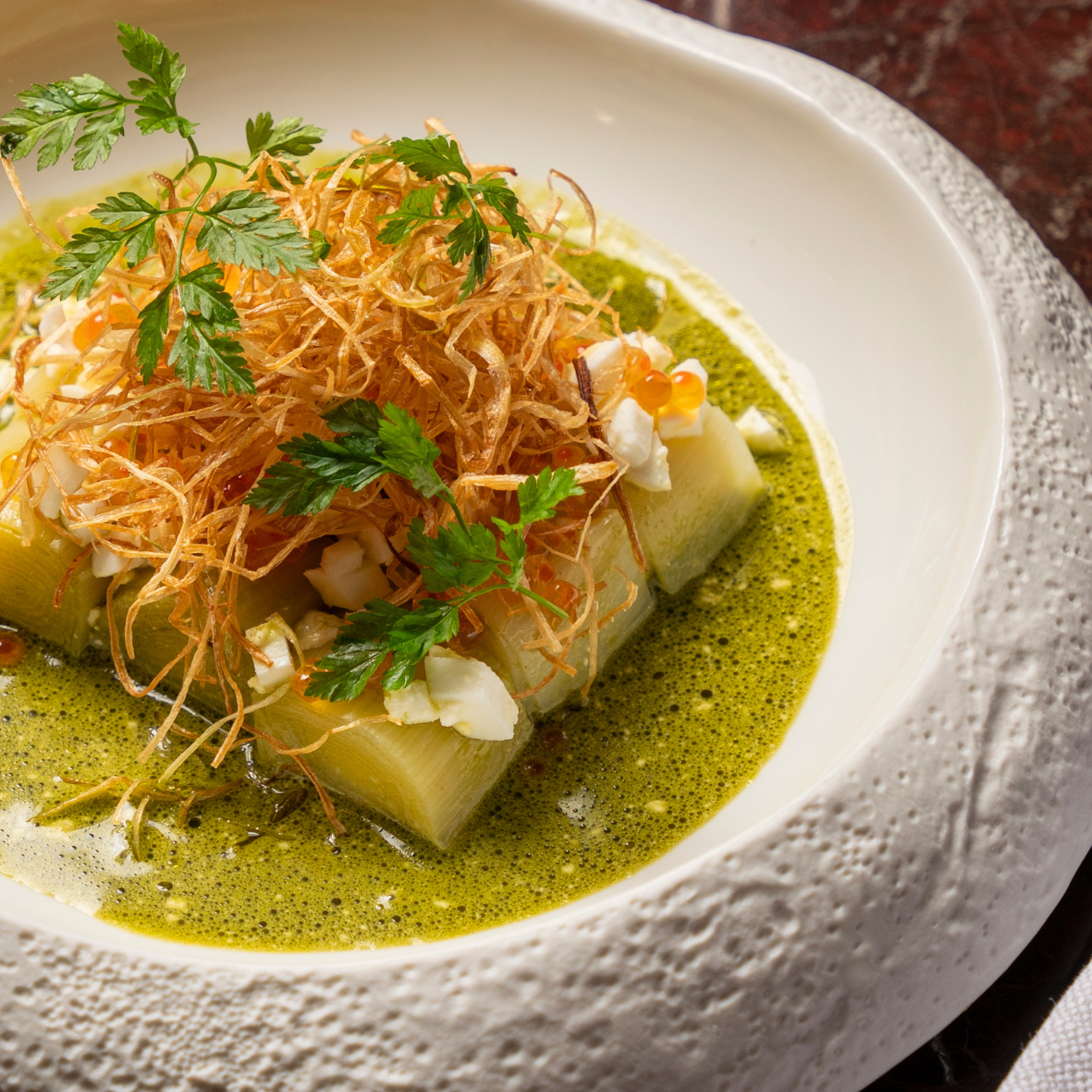 Leek dressed in fresh herb vinaigrette, garnished with capers