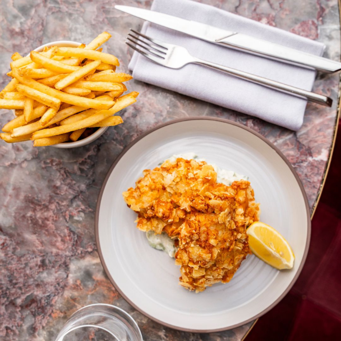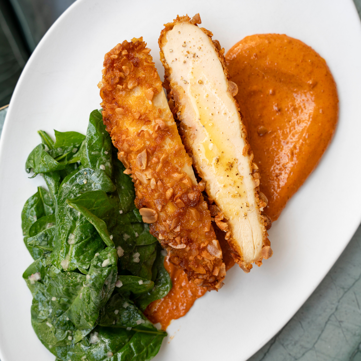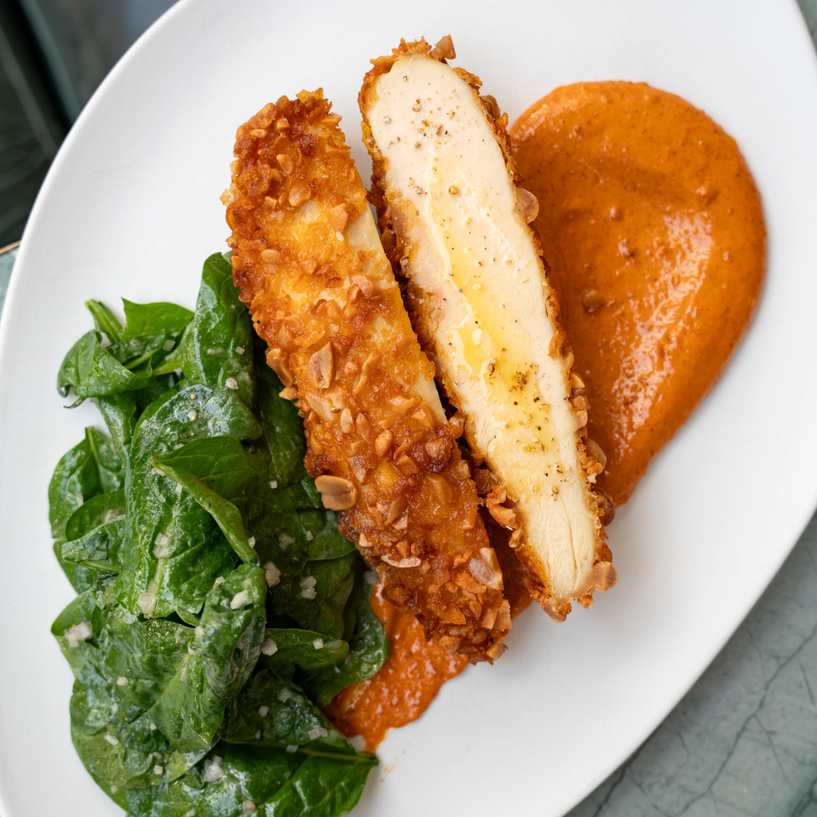 Breaded chicken with peanuts and cornflakes, cajun sauce
