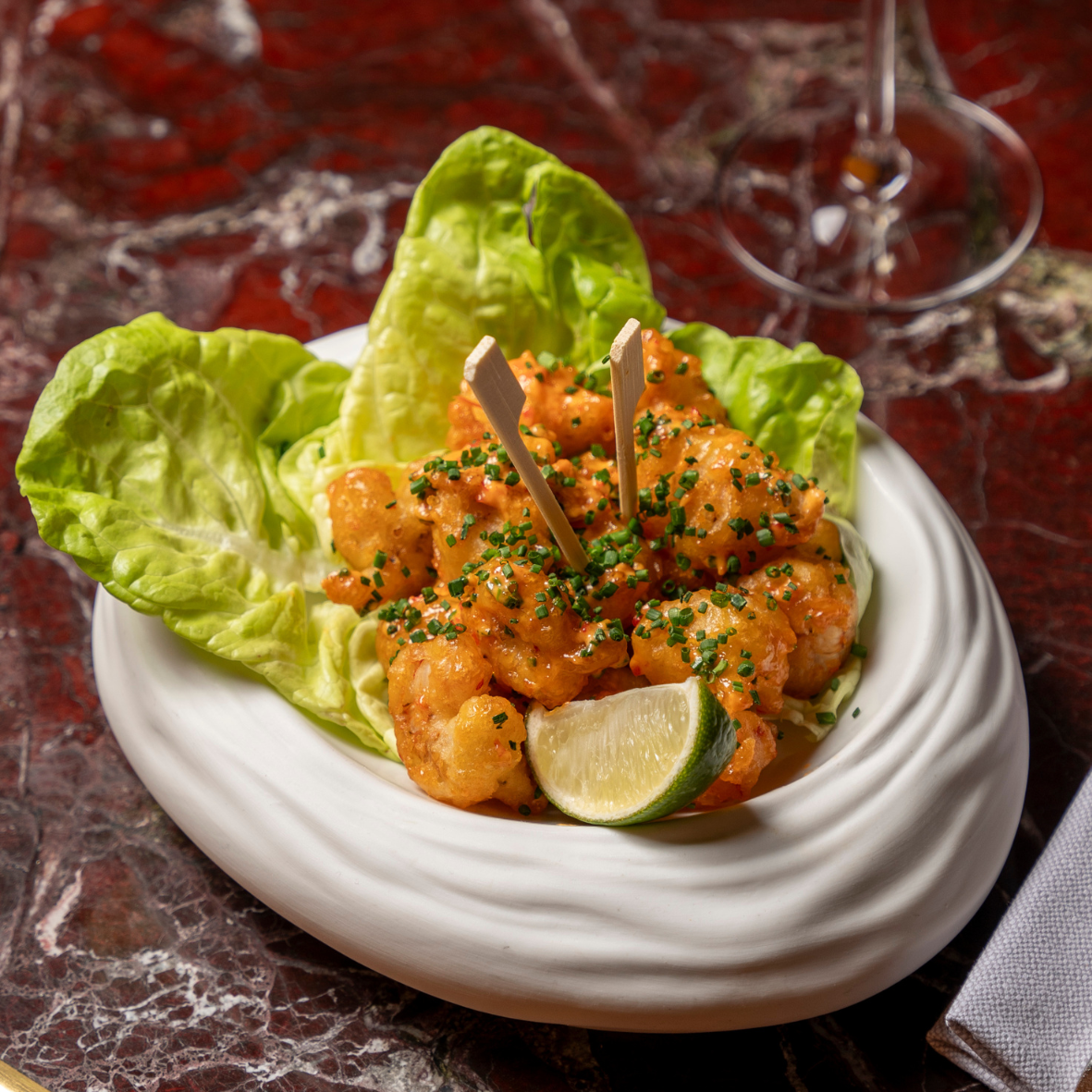 Crispy rock shrimp coated in chili-garlic glaze