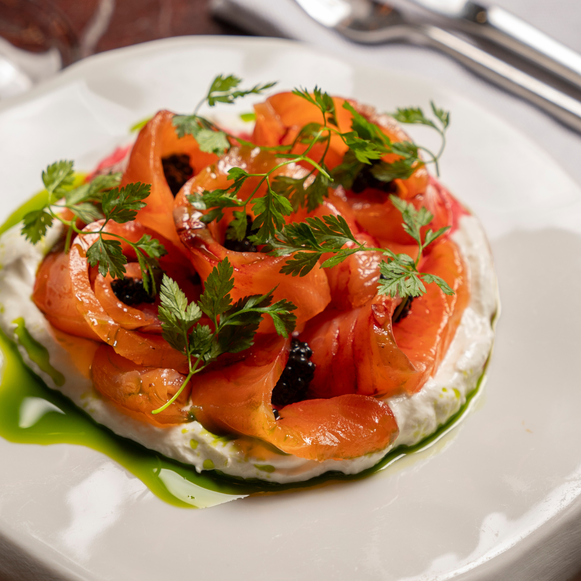 Salmon gravlax marinated with pink peppercorns and fresh dill, served with horseradish yogurt and smoked fish roe