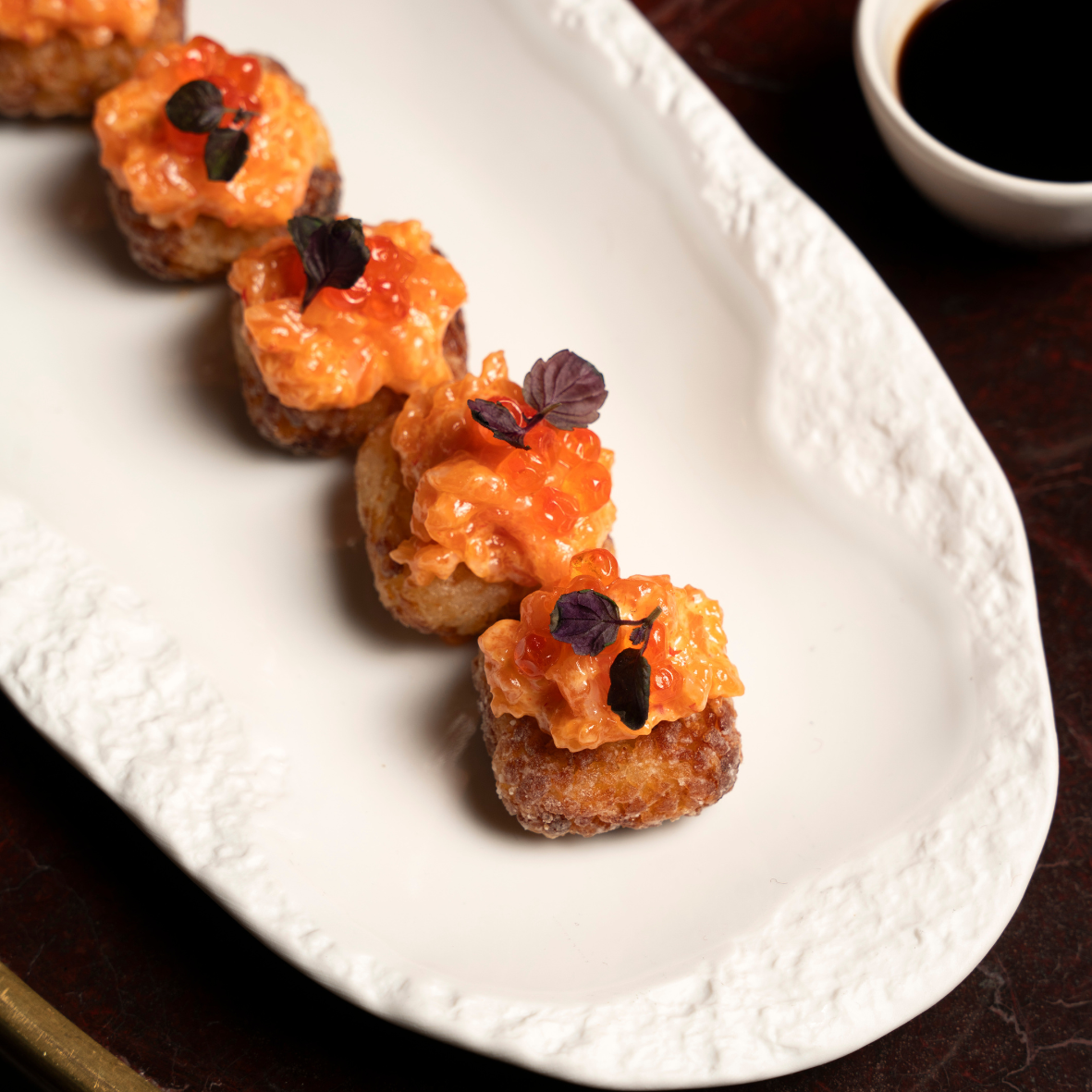 Crispy sushies, spicy salmon and smoked trout roe