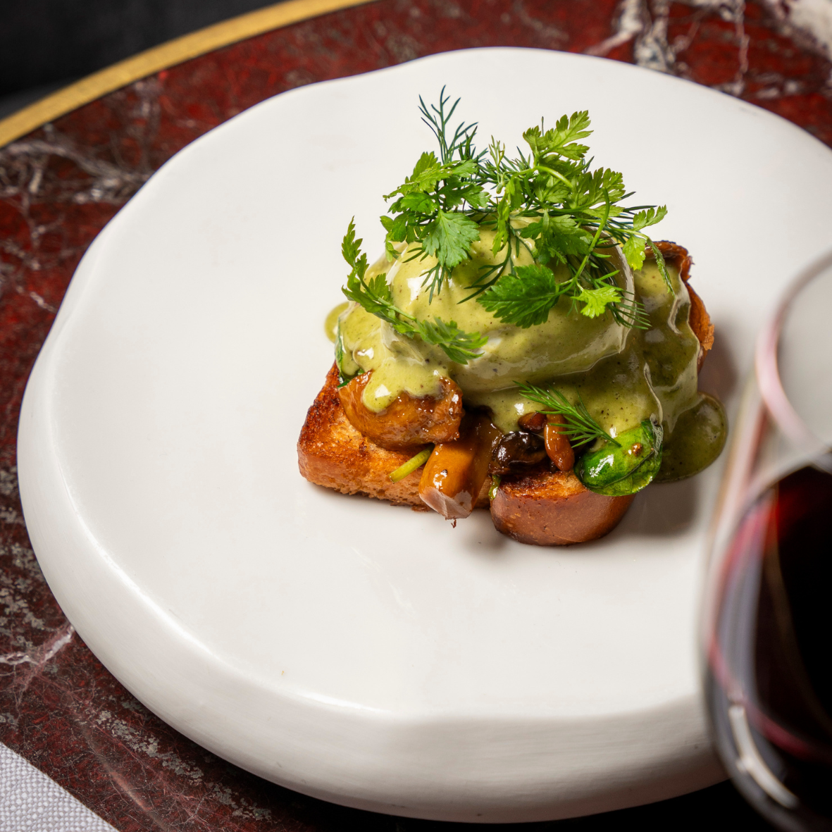 Our signature Egg Benedict served on toasted brioche, with oyster mushrooms and a rich Béarnaise sauce