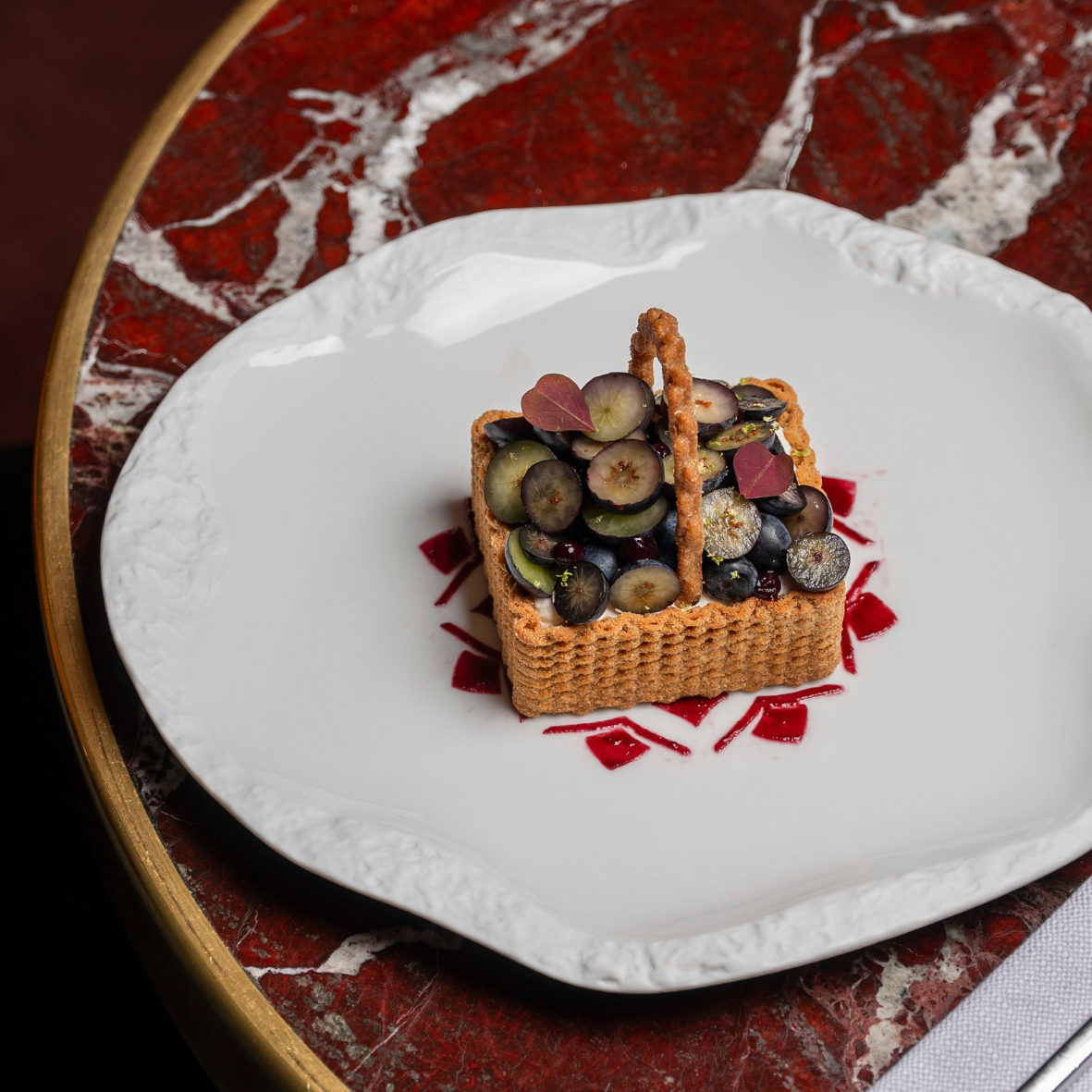 Blueberry basket with financier biscuit and Fontainebleau cream