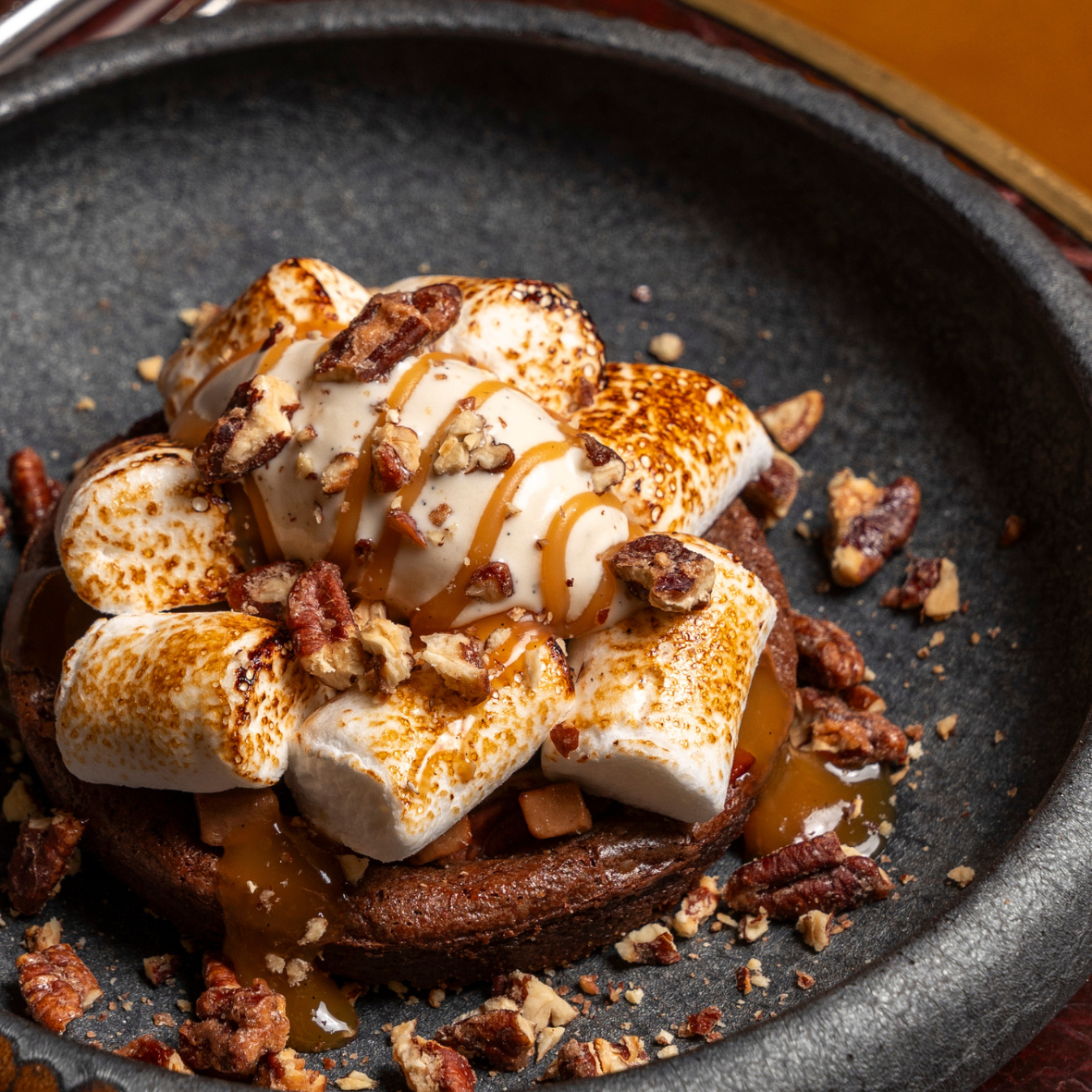 American brownie with pecans, smooth caramel, and toasted marshmallows