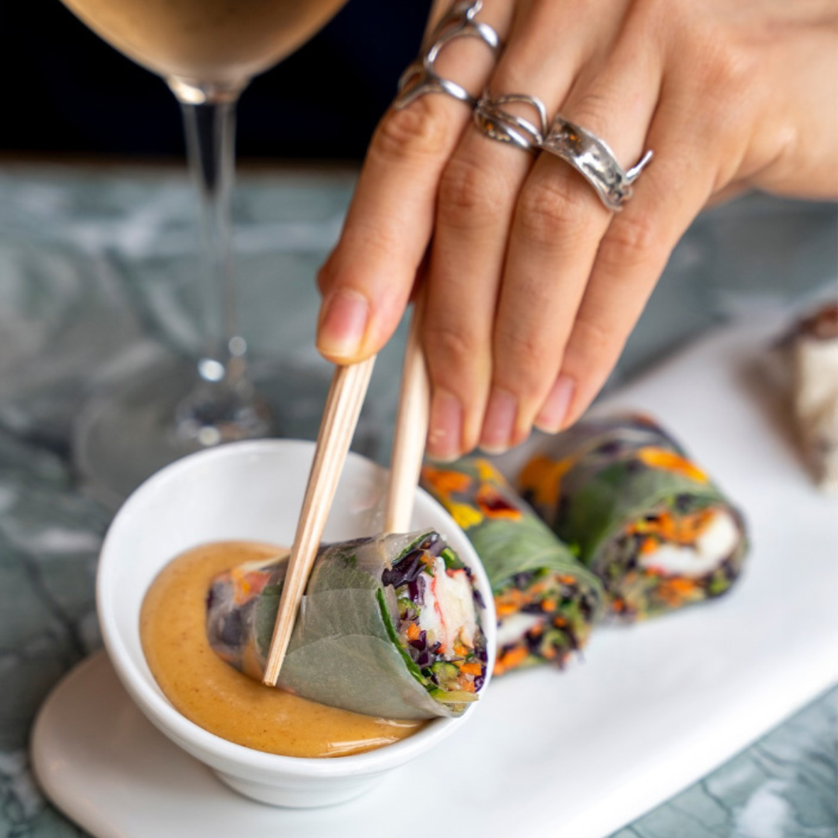 King crab spring roll, vegetable, flowers and peanuts
