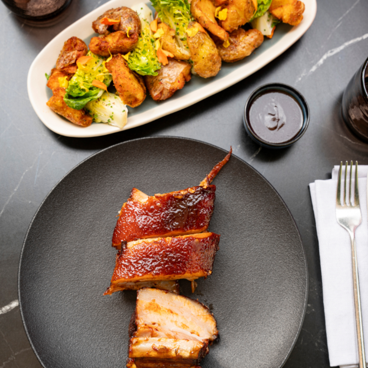 Pork ribs with barbecue sauce, patatas bravas classic meats