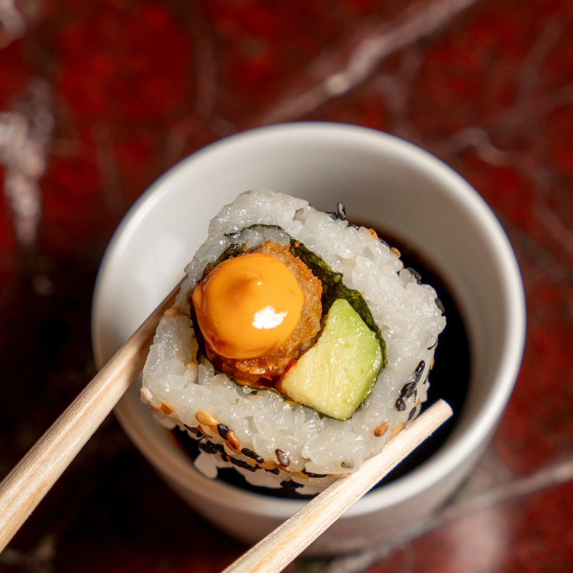 California Roll featuring crispy breaded shrimp, creamy avocado, and a spicy chili-garlic sauce