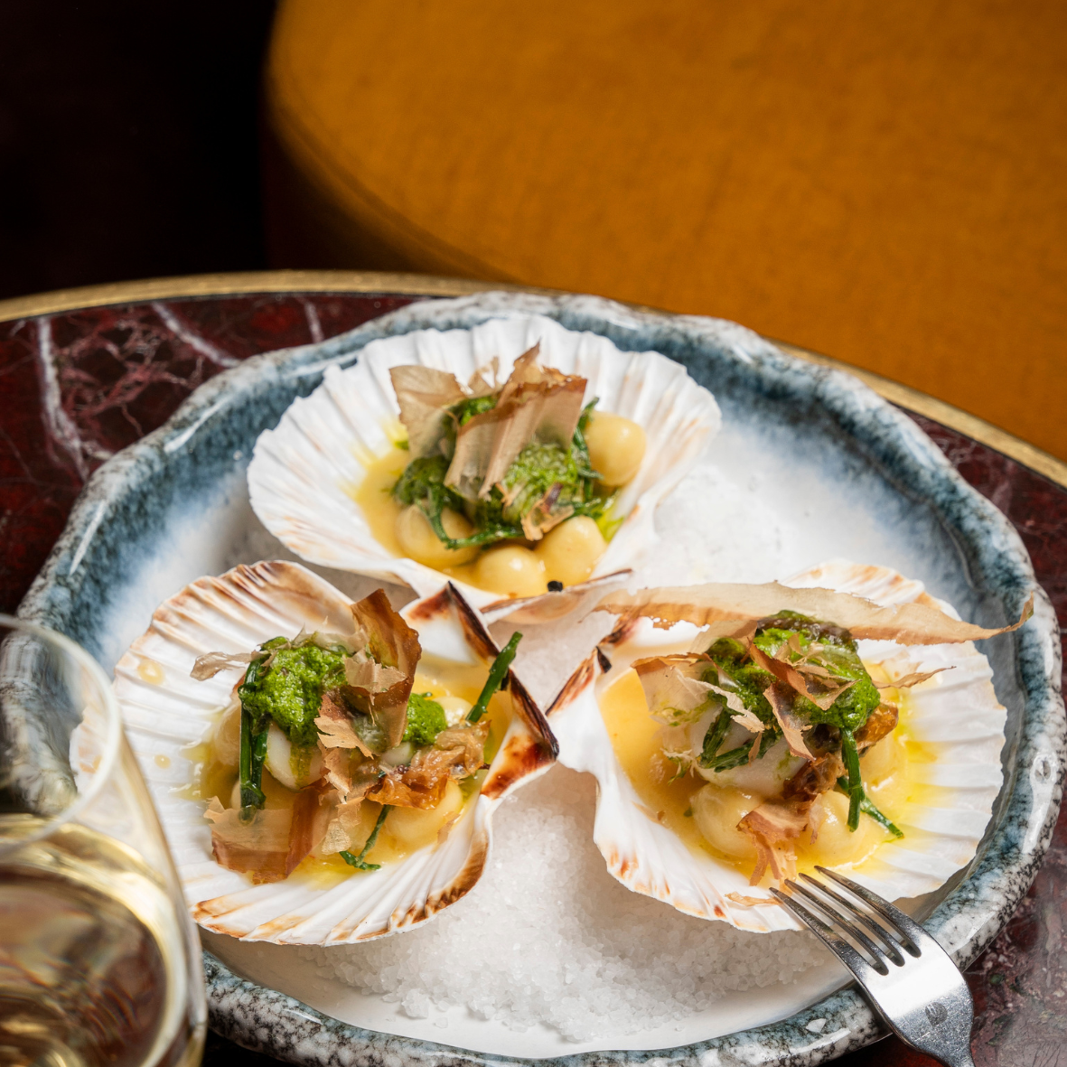 Scallops seared in seaweed butter and katsuobushi, served with gnochetti in a delicate watercress jus and samphire