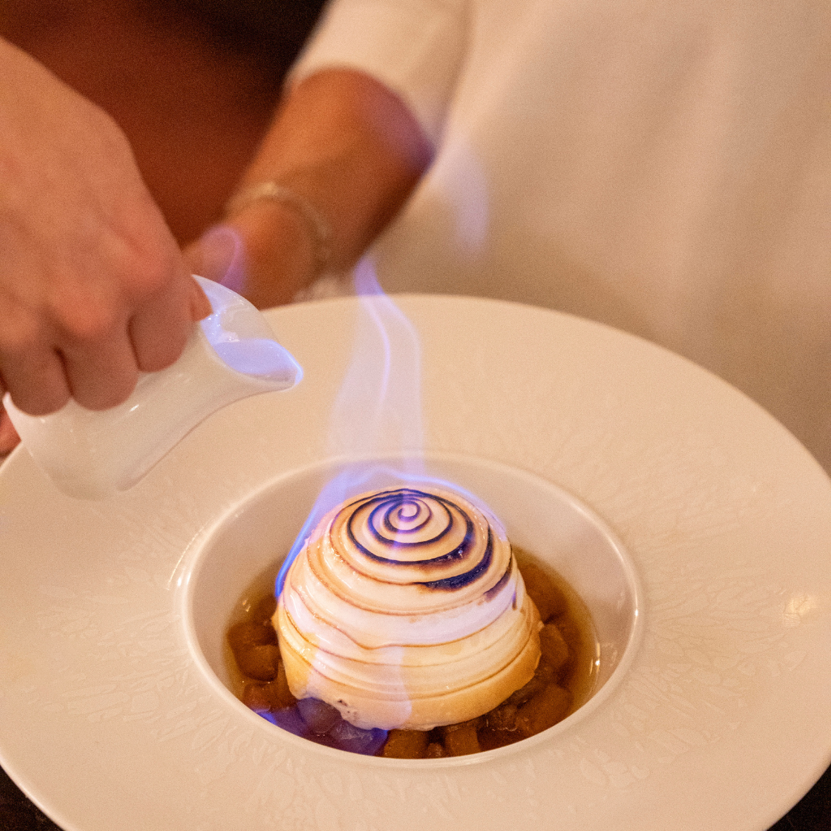 Baked Alaska with pineapple flambéed in Grand Marnier