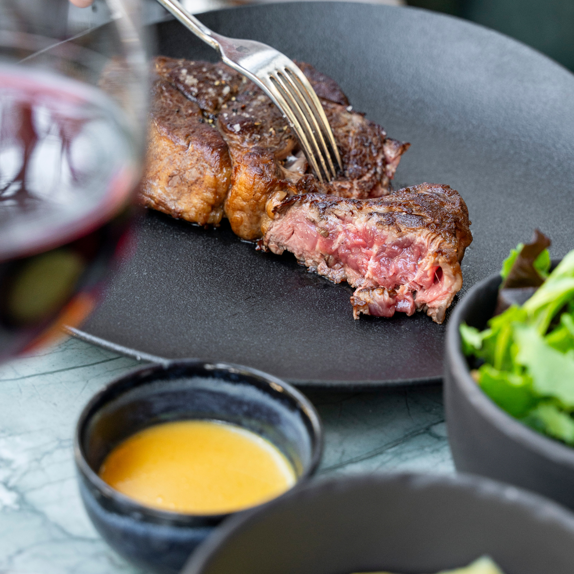 Angus ribeye, yellow chilli and yuzu sauce, mashed potatoes