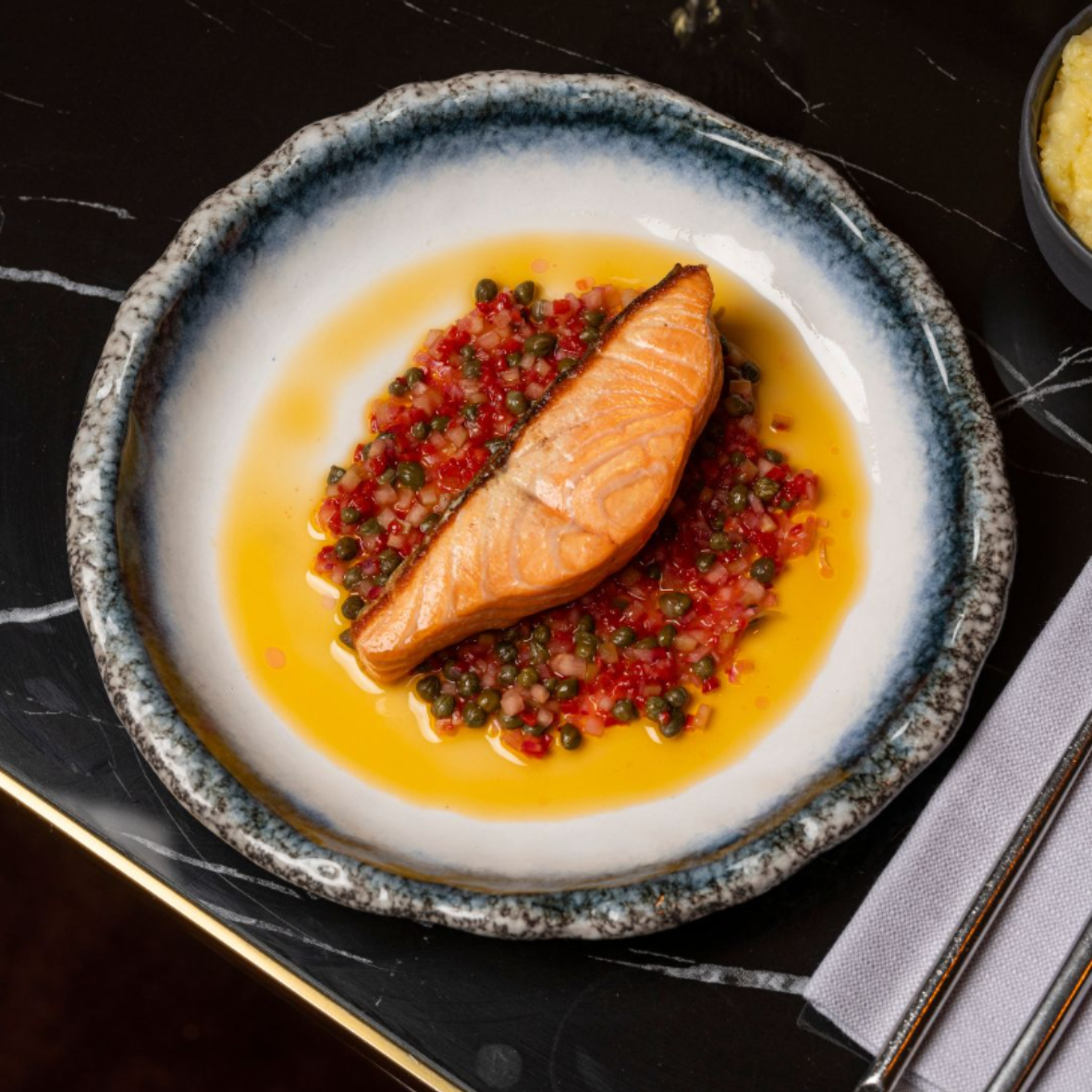 Medium rare Label Rouge Scottish salmon à la plancha, condiments and mashed potatoes with candied lemon